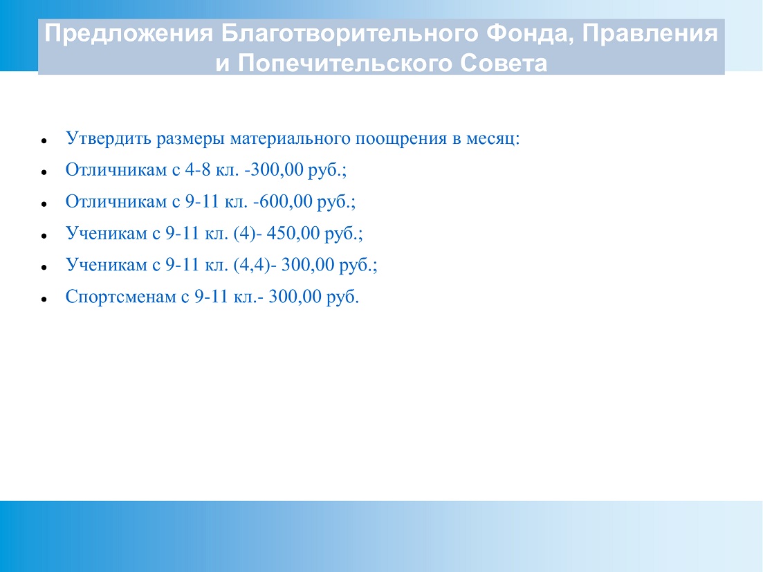 Предложение Благотворительного Фонда, Правления и Попечительского совета по размеру поощрения